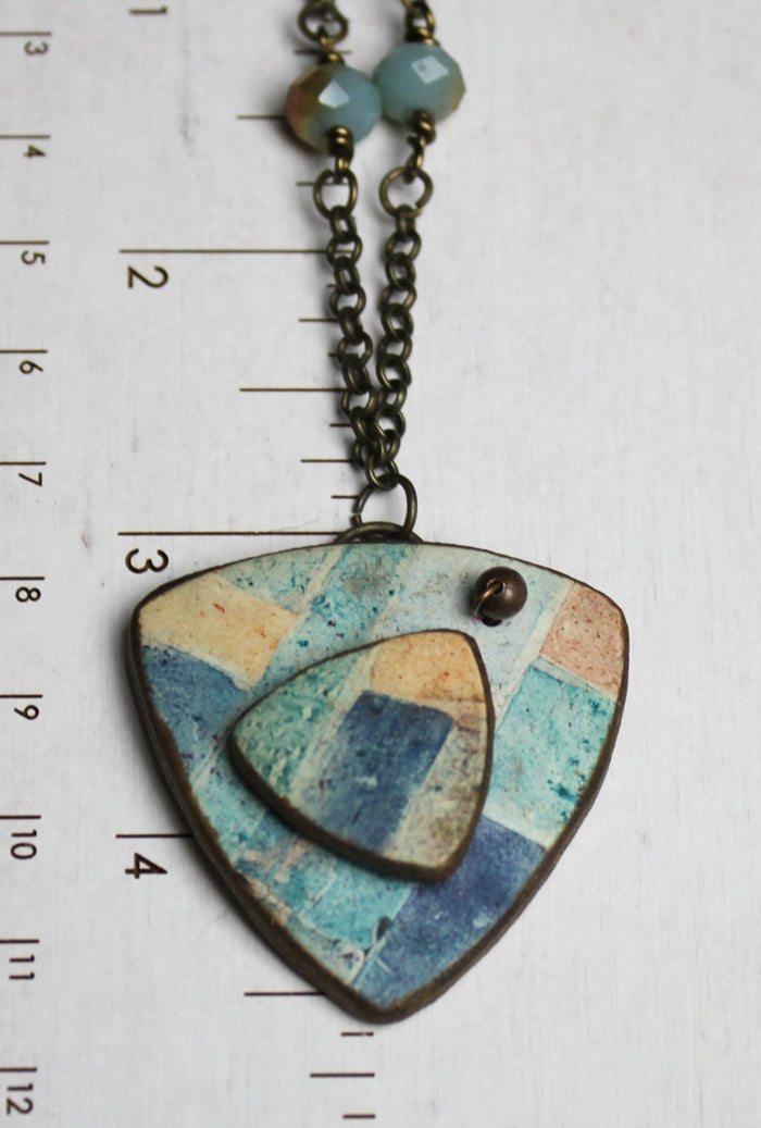 A unique layered pendant featuring hand-colored and collaged polymer clay in warm autumn tones with patchwork design. The two-triangle construction showcases blues, teals, creams, and coral patches that create a quilted effect reminiscent of fall landscapes.