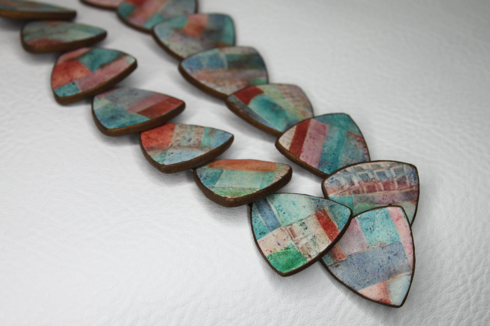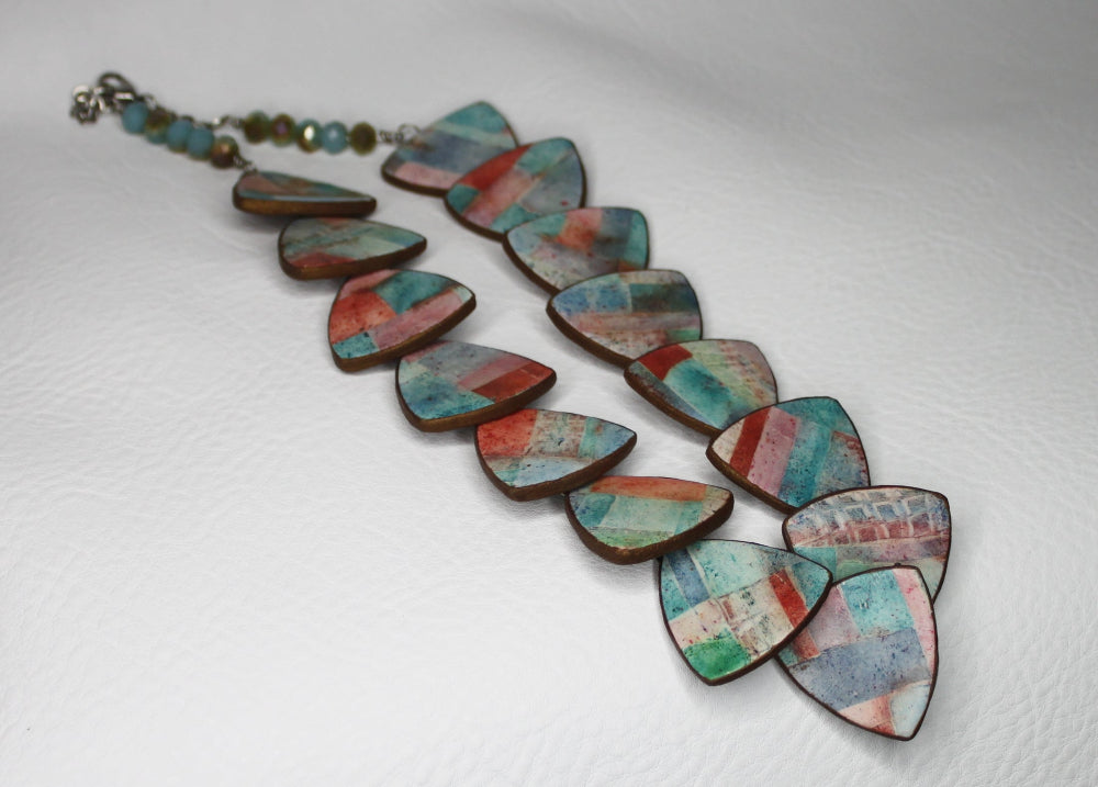 A breathtaking cascade of overlapping triangular pieces creates this show-stopping statement necklace. Each element showcases the beautiful transition from summer's aqua brightness to autumn's coral and terracotta warmth, flowing together like falling leaves or flowing water. The overlapping design creates depth and movement, while coordinating beads complete this wearable work of art. This is the crown jewel of the seasonal collection. Lightweight polymer clay with glass beads.