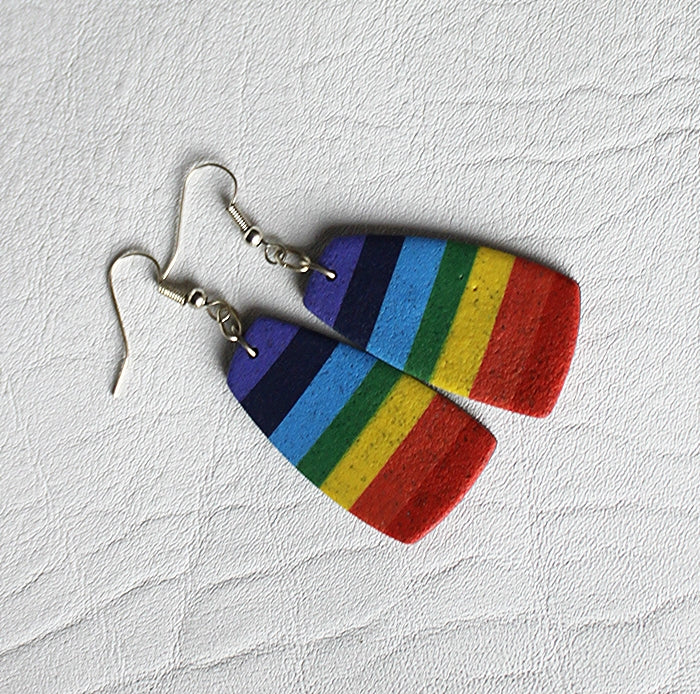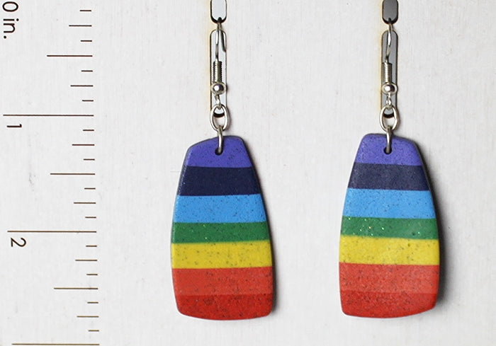 Vibrant rainbow stripes flow in horizontal bands in these uplifting elongated rectangle earrings. The speckled texture adds depth while the bold stripes make a joyful statement. Perfect for adding positive energy and color to any outfit. Lightweight polymer clay with stainless steel ear wires.