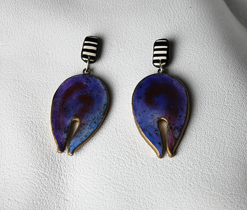 Classic black and white stripes meet mystical deep purple in these whimsical statement earrings. The graphic striped rectangular top contrasts beautifully with the unique tulip-inspired drop shape featuring a distinctive bottom cutout. Rich indigo and purple tones with subtle color variations create depth and intrigue. This playful two-piece design creates movement and visual interest. Lightweight polymer clay with stainless steel posts for comfortable all-day wear.