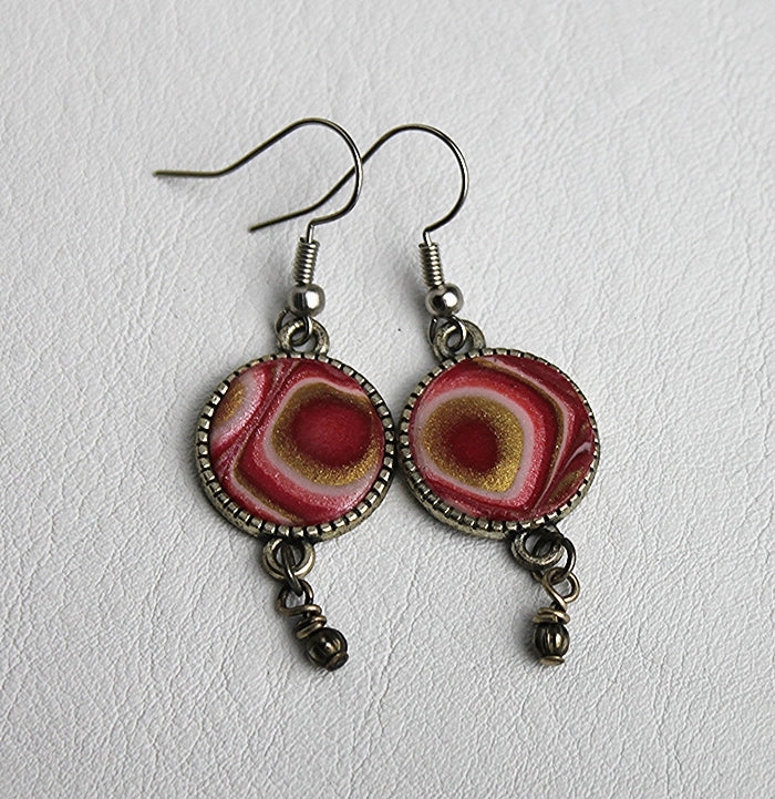Concentric circles in red, pink, and gold flow together using the ancient mokume gane technique in these striking earrings. The organic patterns create beautiful depth and movement within decorative silver-tone bezels. Silver plated bead dangles add elegant finishing touches to these sophisticated statement pieces. Each piece showcases unique color flow, making these earrings truly one-of-a-kind. Lightweight polymer clay with silver-tone findings and stainless steel ear wires."