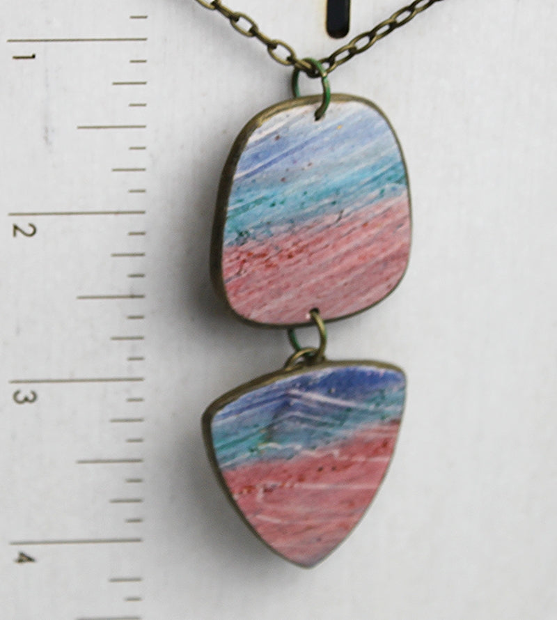 Like shorelines where ocean meets land, in this beautiful pendant necklace coral and blue tones blend and transition across each piece. The weathered, textured finish evokes a weathered coastline shaped by endless tides. This pendant celebrates the natural beauty of the coast. Lightweight polymer clay pendant on 20-inch bronze cable chain.