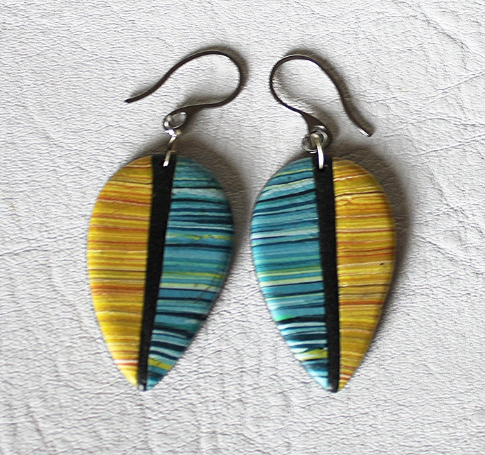 Stunning curved stripes in vibrant turquoise and golden yellow create dynamic movement in these elegant leaf-shaped earrings. Created using a technique developed by renowned polymer clay artist Donna Kato, the precise striping showcases her invention. The bold black center stripe provides striking contrast while the flowing lines add visual interest and sophistication. Lightweight polymer clay with stainless steel ear wires for comfortable wear.