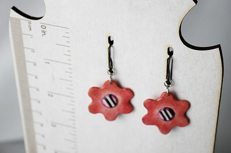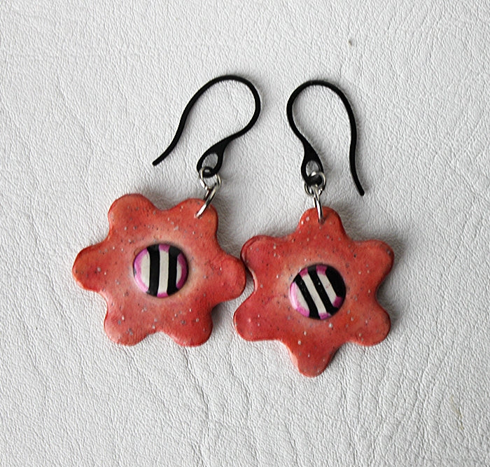 Vibrant tangerine polymer clay blooms into cheerful flower shapes with playful black and white striped centers. These fun statement earrings bring instant joy and retro flair to any outfit. The bright coral-orange color with subtle speckled texture catches light beautifully while remaining lightweight for comfortable all-day wear. Finished with stainless steel ear wires for sensitive ears. Perfect for adding a bold pop of sunshine to your look!